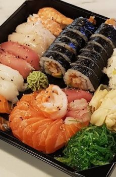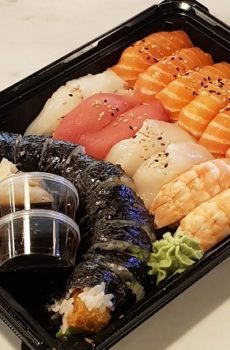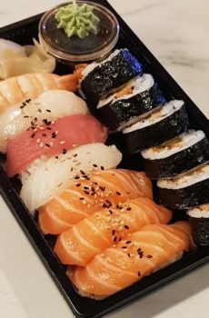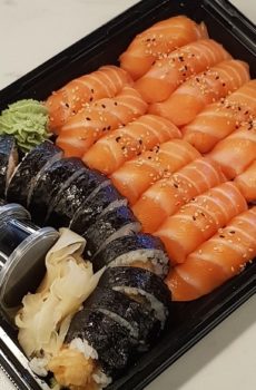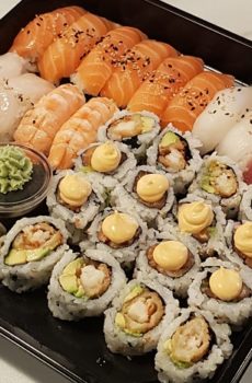 Nigiri: 6 laks, 2 kveite, 2 tunfisk, 2 kamskjell, 2 scampi. Maki: 8 spicy laks og 8 tempura maki